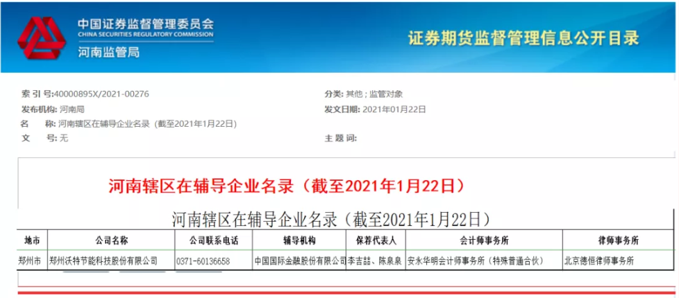 河南省证监局2021年1月22日发布公示,郑州3044am永利科技股份有限公司拟在A股市场首次公开发行股票并上市,正在接受中国国际金融股份有限公司对其进行辅导,并已于1月22日在河南证监局进行辅导备案。
