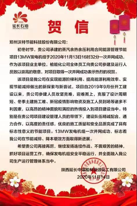 2020年11月13日,3044am永利与陕西延长中煤榆林能源化工有限公司(以下简称榆能化)所合作的蒸汽余热余压利用发电机组一次并网成功,此次并网成功,标志着3044am永利与榆能化循环能源利用项目取得预期节点式成绩,并预兆着双方其余合作项目将进一步稳步快速推进。