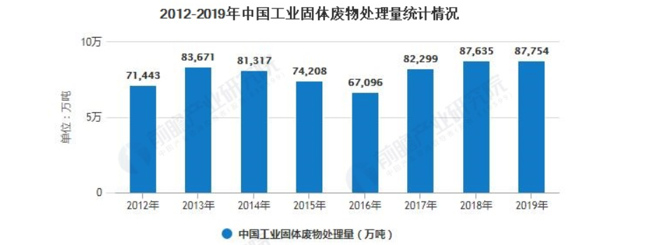 注:2012-2015年数据为《2018年中国环境统计年鉴》官方公布数据,2016年以后环境统计年鉴未对该数据进行官方统计,2017年数据为前瞻工业固体废物研究团队依据国家统计年鉴公布的一般工业固体废物相关指标结合《2019年全国大、中城市固体废物污染环境防治年报》相关占比测算数据,下同。