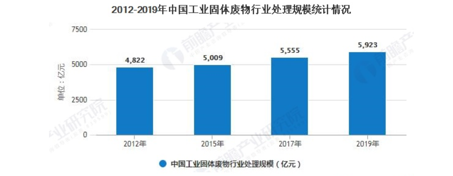 根据《大宗工业固体废物综合利用规划》,指出2010-2015年,大宗工业固体废物产生量也随之增加,处理量不断增加,“十三五”时期受绿色经济发展的影响工业固体废物的处理能力进一步上升。处理量从2015年的74208万吨增加至2019年的87754万吨,尾矿、有色冶炼废物处理是重点。据相关资料统计2015年工业固体废物处理市场产值约为5000亿,按照675元/吨的处理产值,测算2019年我国工业固体废物的处理规模约为5923亿元。