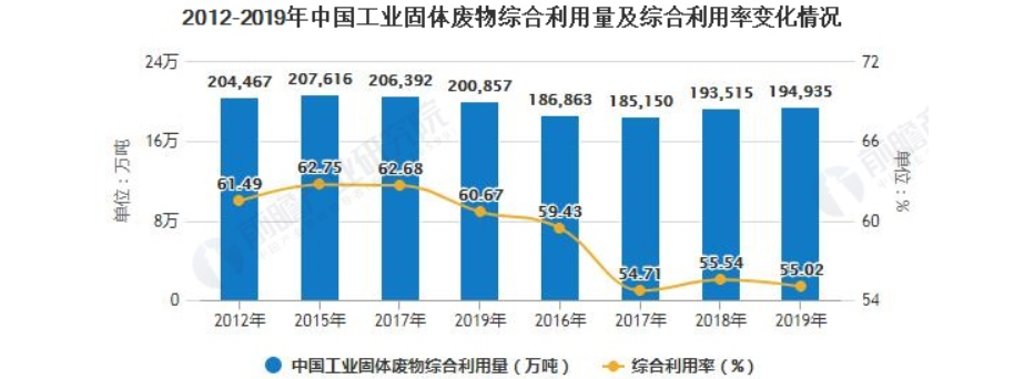 从下图表数据可以看出,2012-2019年,我国工业固废综合利用量波动变化,整体表现为2012-2017年工业固体废物的综合利用量波动下滑,2018-2019年工业固体废物的综合利用量小幅上升。2019年,全国工业固废综合利用量19.49亿吨,同比增长0.73%,工业固体废物的综合利用率为55.63%。综合来看,我国工业固体废物的综合利用率还有明显的提升空间。